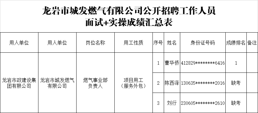 龍巖市政建設(shè)集團(tuán)有限公司所屬企業(yè)公開(kāi)招聘工作人員擬錄用公示 根據(jù) 2025年4月21日發(fā)布的《龍巖市政建設(shè)集團(tuán)有限公司關(guān)于公開(kāi)招聘工作人員的公告》有關(guān)要求,經(jīng)報(bào)名、資格審查、組織考試、體檢、考察等程序,現(xiàn)將龍巖市城發(fā)燃?xì)庥邢薰救細(xì)馐聵I(yè)部負(fù)責(zé)人崗位擬錄用人員名…