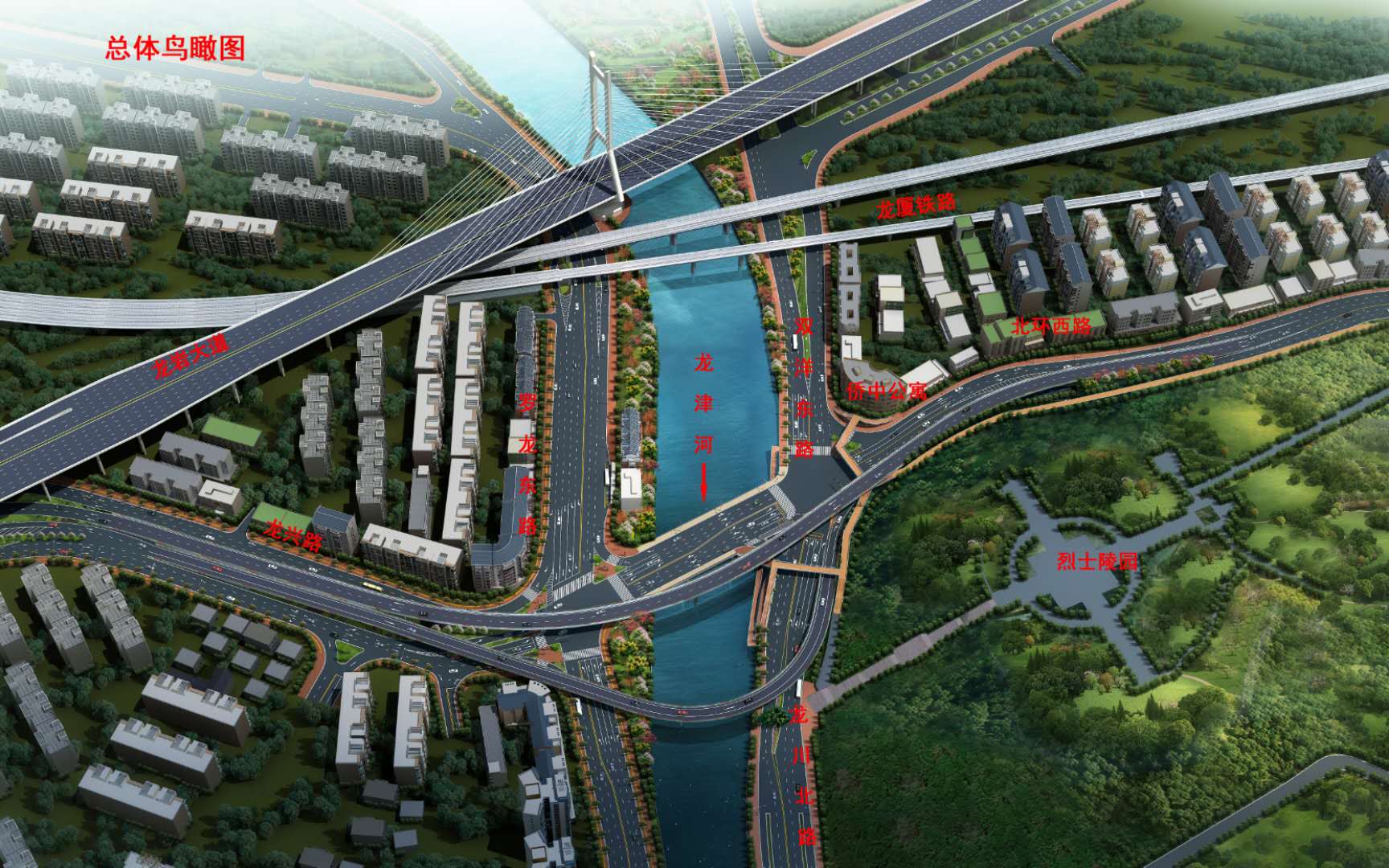 沿北環(huán)西路、龍興路設置南北分離式雙向四車道高架,南側(cè)接龍興路,北側(cè)接現(xiàn)狀北環(huán)西路,高架靠東側(cè)布置(緊貼烈士陵園),橋梁總長約1140米,凈寬約7.7米;在雙洋路、龍川北路、北環(huán)西路設置人行天橋,與山體步道銜接,以完善慢行系統(tǒng);在烈士陵園山體下采用明挖回填方式設置框涵,長度約225米,凈寬10.75米。