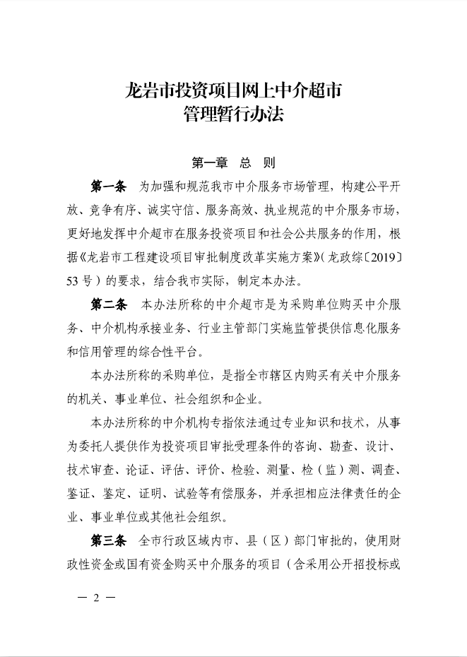 龍巖市人民政府辦公室關于印發(fā)龍巖市投資項目網(wǎng)上中介超市管理暫行辦法的通知(龍政辦[2019]111號)