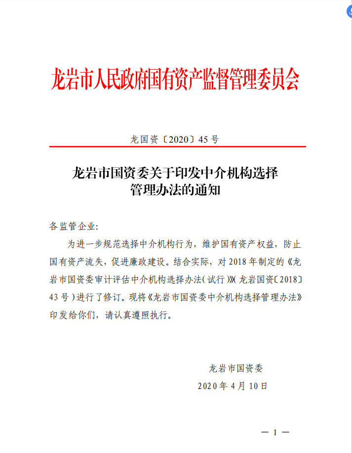 龍巖市國(guó)資委關(guān)于印發(fā)中介機(jī)構(gòu)選擇管理辦法的通知(龍國(guó)資[2020]45號(hào))